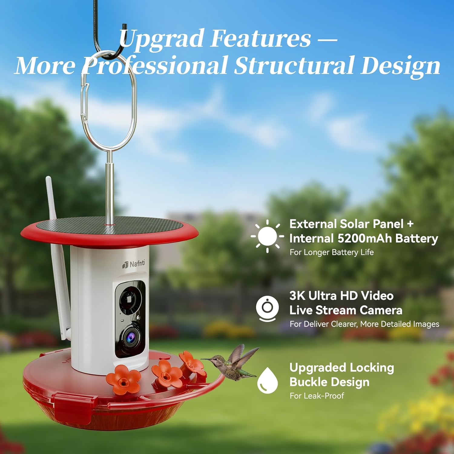 Solar Powered for All-Weather Hummingbird Monitoring: Solar Hummingbird Feeder Built-in 5200mAh battery + top 2W solar panel for continuous sunlight charging. Solar-battery hybrid system ensures reliable power on cloudy days, supports 24/7 operation, ideal for year-round hummingbird watching.