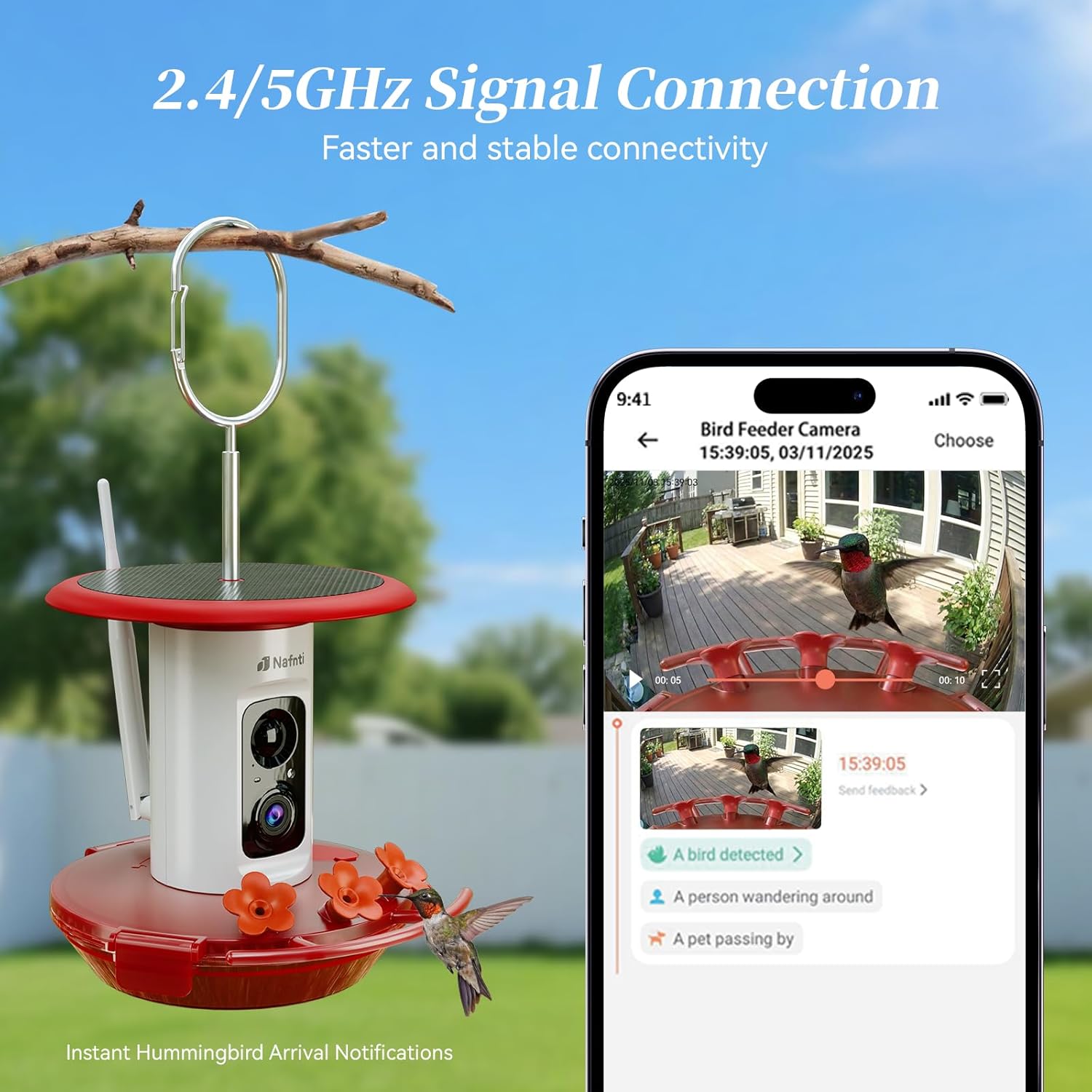 3K Ultra HD and Smooth Dual-Band Wi-Fi for Real-Time Viewing: Smart Hummingbird Feeder features industry-leading 3K resolution and ultra-wide-angle diagonal field of view, capturing clear details of hummingbirds (wings, beaks, feathers). The full-color night vision function allows you to observe the night activities of visiting birds. Unlike basic feeders limited to 2.4GHz only, our smart hummingbird feeder supports 5GHz dual-band WiFi for a stronger, more reliable connection.