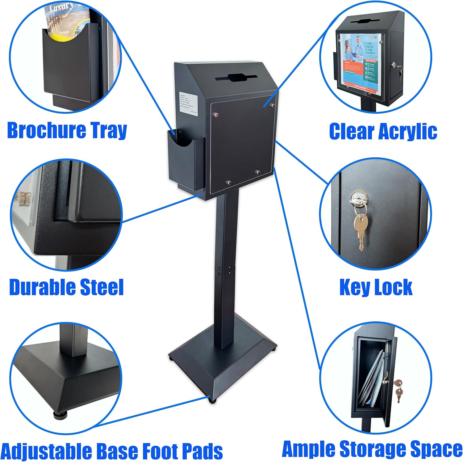 Suggestion Box with Stand, Floor Standing Metal Locking Ballot Collection Safe Box for Voting, Charity, Donation, Church, Election, Hospital Feedback, and Car Rental Key Return, Black