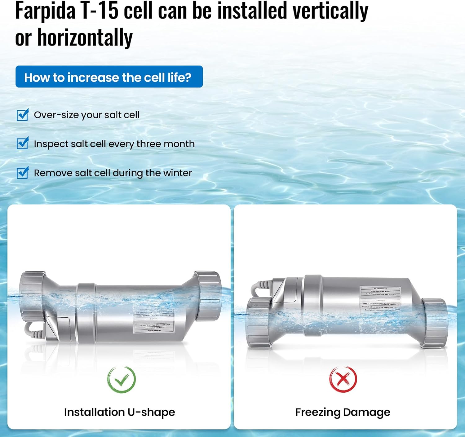 【Functional Benefits】 T-15 pool salt cell utilizes salt molecules to produce chlorine during electrolysis, cuts chlorine costs up to 56%, delivers silky smooth water that’s gentle on skin & eyes