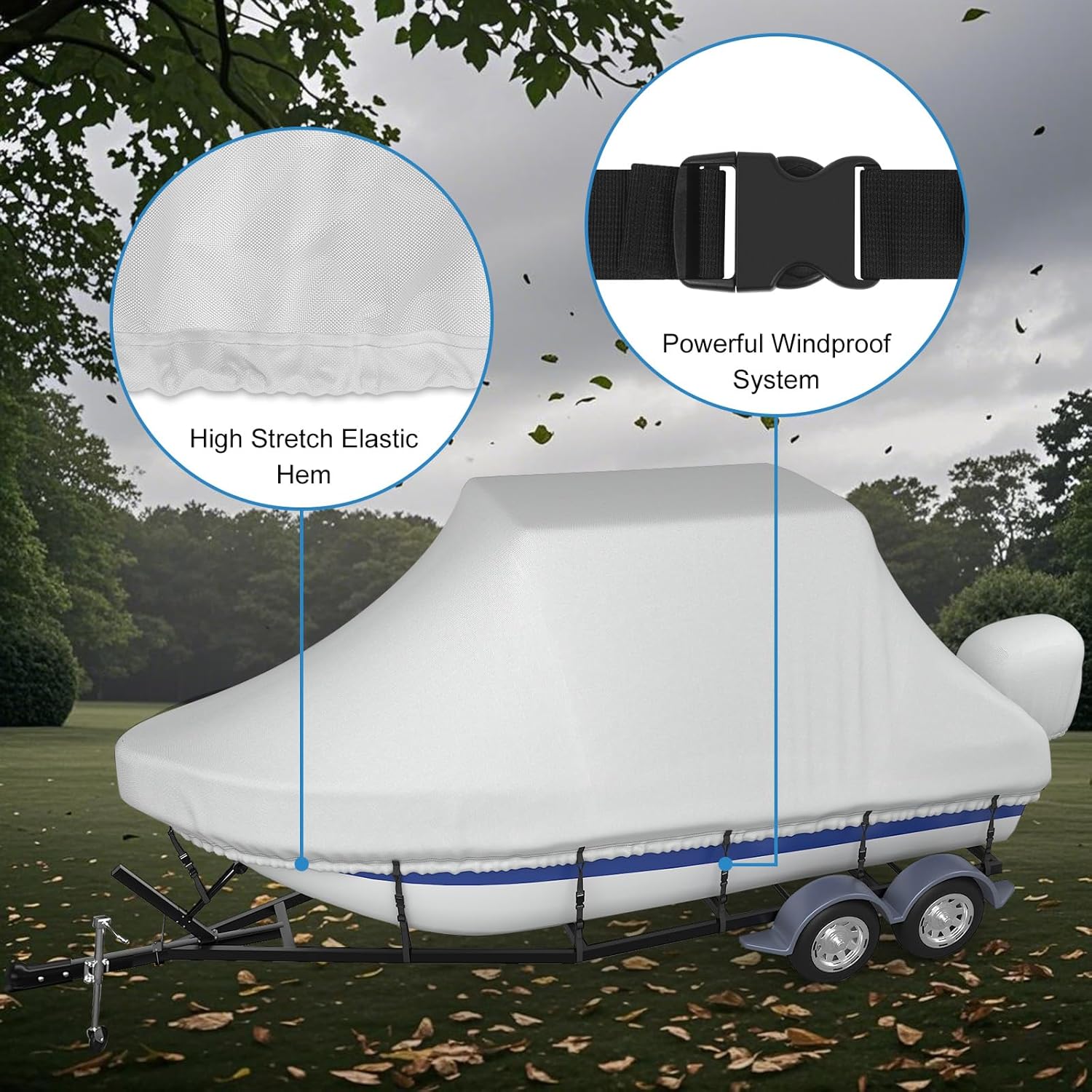 20-22FT Package Included: Includes 1 x heavy duty boat cover (length up to 20-22 feet, beam width up to 106 inches), 18 x webbing, 1 x motor cover, and 1 x storage bag to meet protection and storage needs.